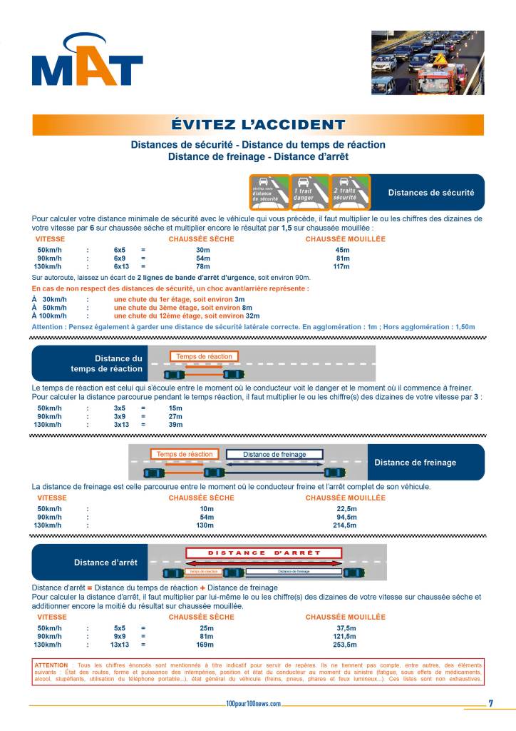 Quelles sont les distances de sécurité à respecter ? A quoi correspond la distance du temps de réaction ? Quelle différence entre distance de freinage et distance d’arrêt ? Si le code de la route indique que « lorsque deux véhicules se suivent, le conducteur du second doit maintenir une distance de sécurité suffisante pour pouvoir éviter une collision en cas de ralentissement brusque ou d’arrêt subit du véhicule qui le précède », comment estimer ces distances en fonction de la vitesse du véhicule ? Pour comprendre ces règles de sécurité et anticiper les dangers de la circulation, MAT Assurance nous apporte les éléments de réponse.
